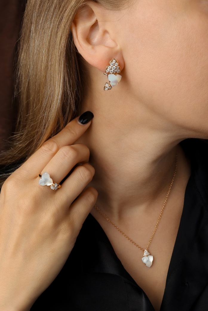Здесь нет резких контрастов – только плавные линии, природные оттенки и ощущение спокойной роскоши. Перламутр отражает свет нежным сиянием, малахит добавляет глубины и символики, а бриллианты расставляют тонкие акценты.