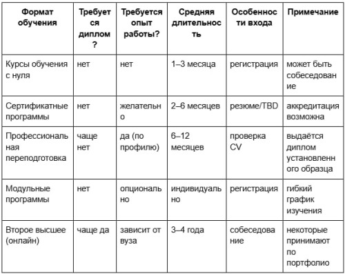Форматы не исключают друг друга: можно начать с обучения с нуля, затем перейти к переподготовке по аккредитованным программам. Для возрастного студента это часто самый безопасный маршрут.