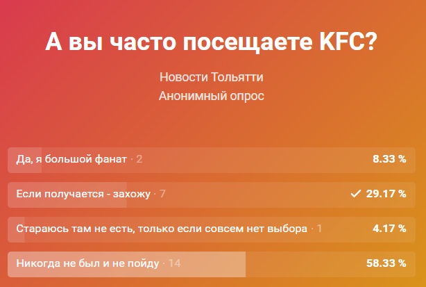 Мы также на днях провели небольшой опрос, среди наших читателей, чтобы узнать, как много людей посещают заведение. Выяснилось, что большинство никогда не были и не собираются туда идти 58%. В комментариях одна жительница Тольятти даже провела сравнение блюд заведения с бумагой, заявляя этим, что далеко не фанат такой кухни. Однако второй по популярности ответ все-таки говорит о том, что есть и те, кто может быть и не является фанатом сети, однако не откажется время от времени от жаренной популярной курочки.