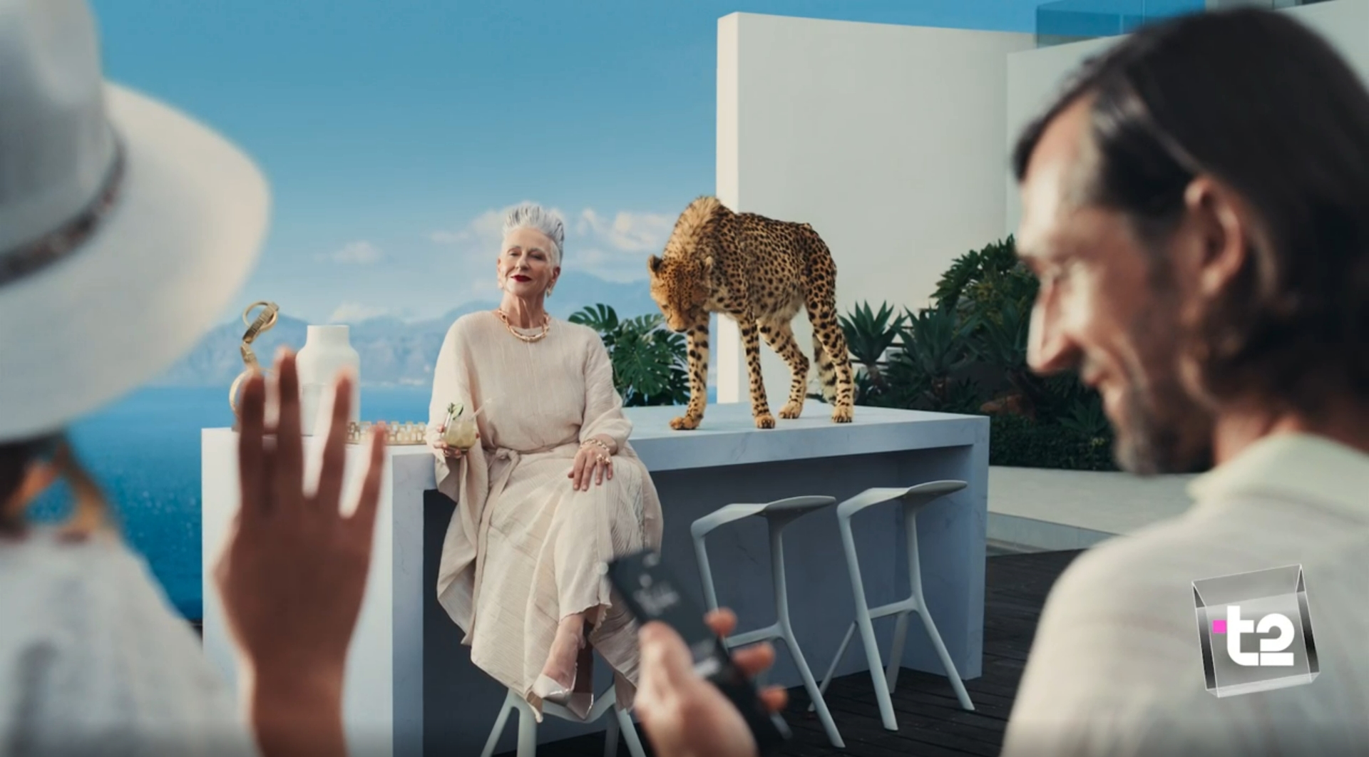 В серии рекламных роликов Т2 решила наглядно продемонстрировать предвкушение выгоды. Это ощущение бренд выразил через отдых на берегу океана и беззаботный танец в компании друзей. Изюминкой этих мечтаний стали экзотические животные. Абонент Виктория проводит время с роскошным ручным гепардом, а герой второго ролика Аркадий танцует в окружении ярких фламинго. Однако героям, как и абонентам оператора, не приходится просто мечтать – их ждет реальная выгода, которую можно получить, приводя друзей в Т2.