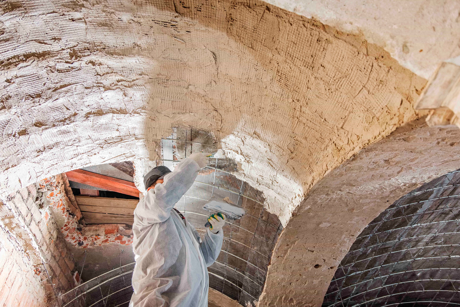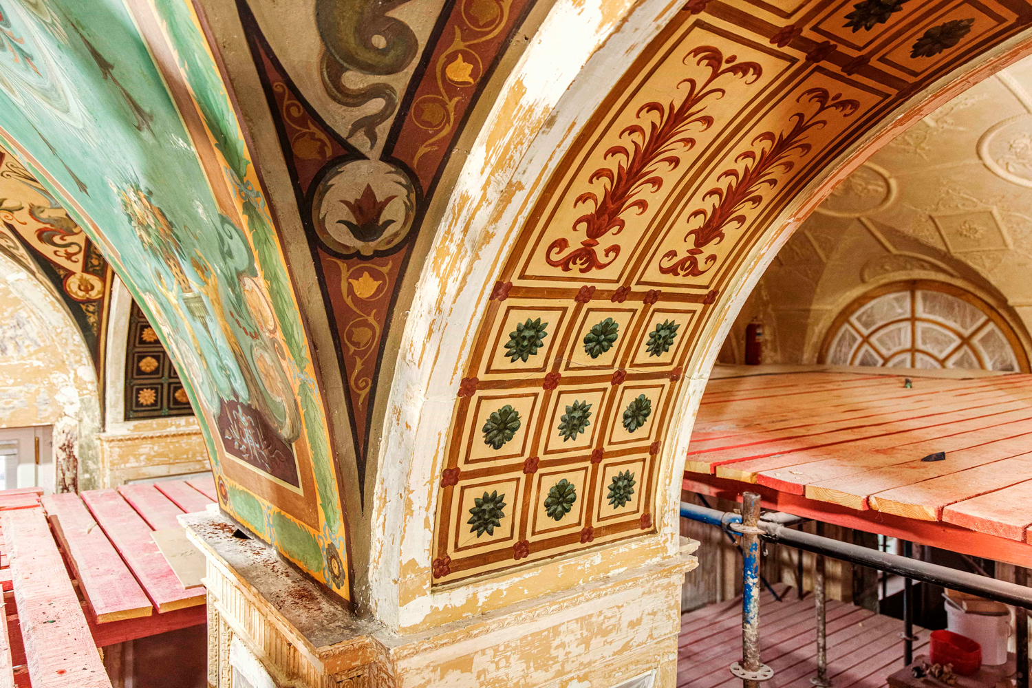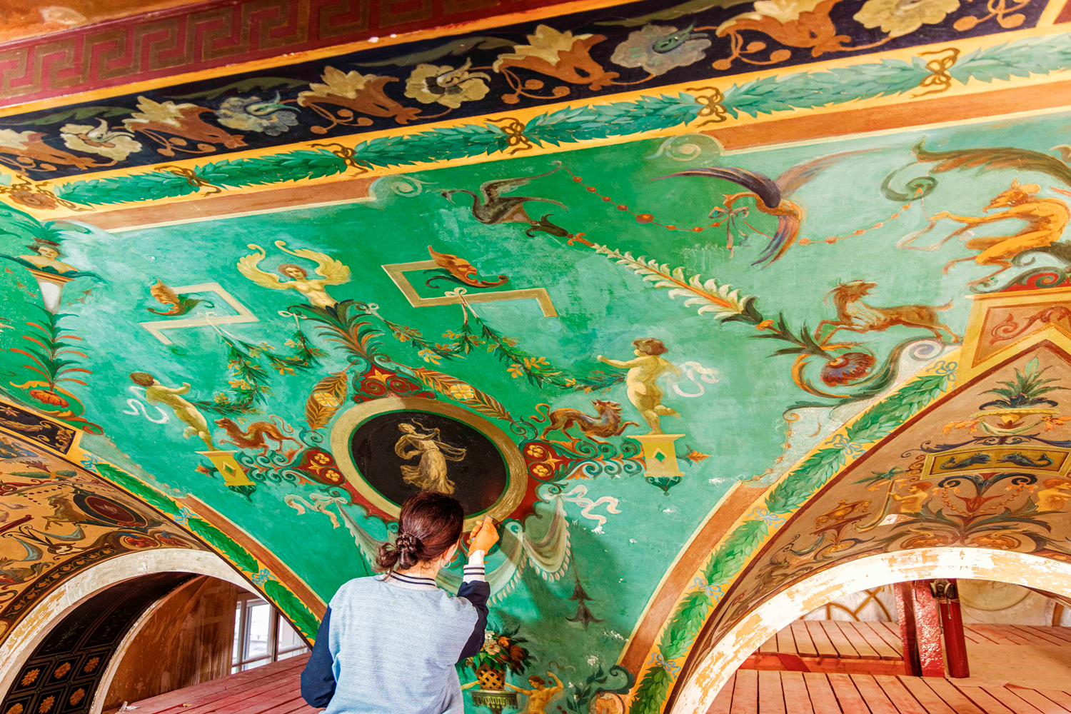 Во всем здании оштукатуривают стены, так как оригинальная штукатурка была сильно повреждена или утрачена, а в специальных образцовых помещениях проводят подготовительные работы для финального этапа реставрации. Специалисты подбирают колера для окраски стен и реставрации паркета. Цветовые решения тщательно выверяют с помощью архивных данных и натурных исследований, чтобы обеспечить максимальное соответствие историческому облику.