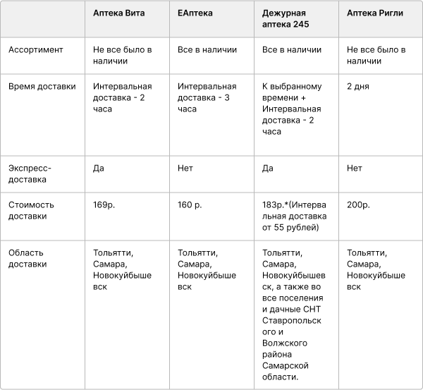 Также смотрела доставку из аптеки Вита. У них есть вариант доставки как можно скорее, но, к сожалению, не указывают сроков доставки. Поэтому мне было непонятно, как долго я буду ждать курьера: 30 минут или 3 часа? К тому же не все нужные мне препараты были в наличии.